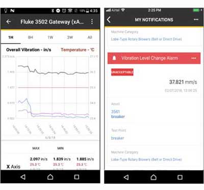 FCCM software generates alarms when abnormalities occur based on 37 machine categories. If the asset experiences conditional changes based on the Fluke Overall Vibration Severity scale, the FCCM software sends instant alarms to smart devices. Alarms can also be seen in the web app. Teams receive push notifications that alert maintenance workers before asset failure.